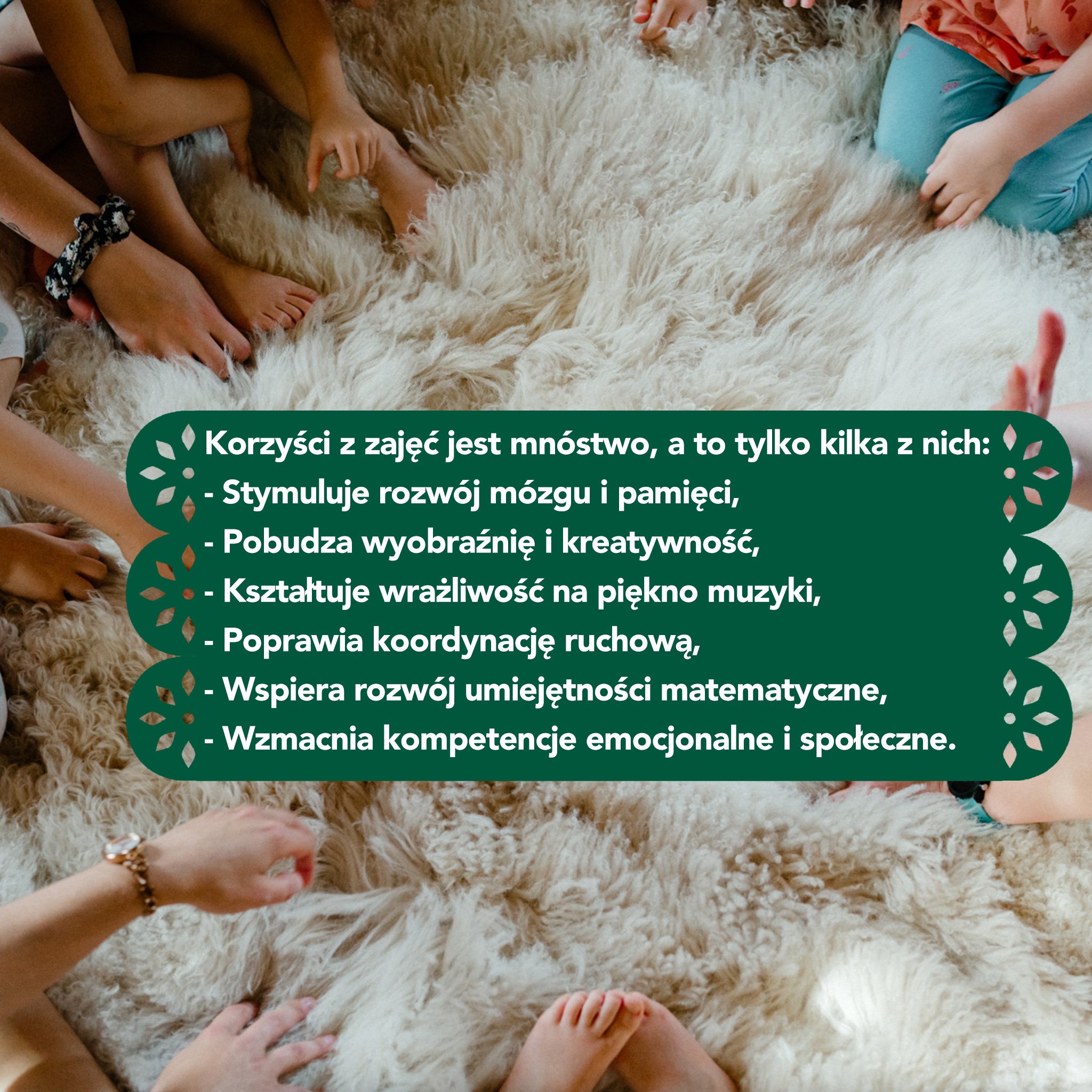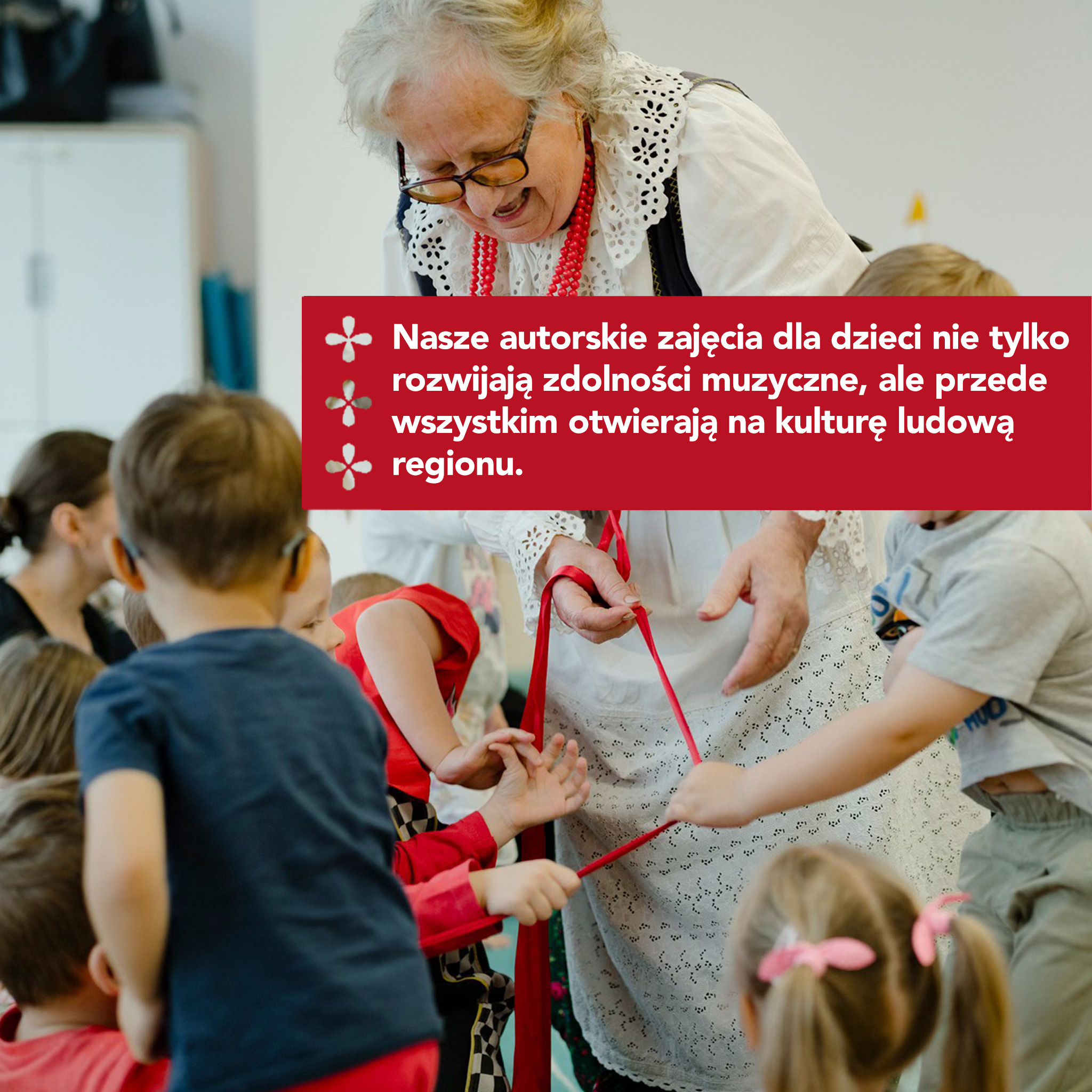 Zajęcia nie tylko rozwijają kompetencje muzyczne, ale przede wszystkim pozwalają dzieciom poznawać kulturę ludową swojego regionu w swobodny, twórczy i bliski naturze sposób.